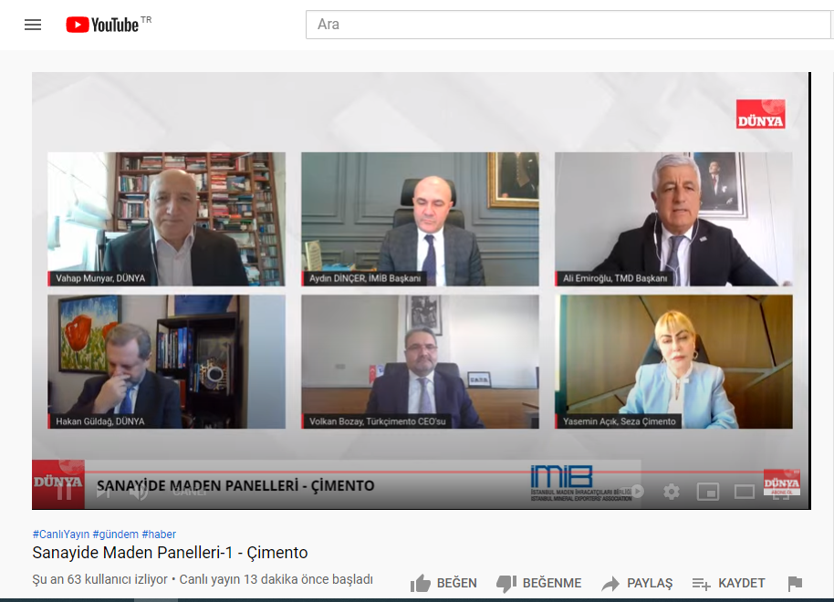 Madencilik sektörünün gelişimi için çalışmalarını sürdüren İstanbul Maden İhracatçıları Birliği (İMİB), Sanayide Maden Panelleri serisinin ilkini Dünya gazetesi iş birliğiyle online platformda düzenledi. Çimento sektörünün konuşulduğu panel, Dünya gazetesi Genel Koordinatörü Vahap Munyar moderatörlüğünde İMİB Yönetim Kurulu Başkanı Aydın Dinçer, Türkiye Madenciler Derneği (TMD) Yönetim Kurulu Başkanı Ali Emiroğlu, Türkçimento CEO’su Volkan Bozay, Seza Çimento Yönetim Kurulu Başkanı Prof. Dr. Yasemin Açık ve Dünya gazetesi Yönetim Kurulu Başkanı Hakan Güldağ’ın katılımıyla gerçekleşti.